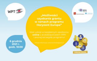 Zapraszamy na bezpłatne spotkanie konsultacyjno-informacyjne online z przedstawicielem Regionalnego Punktu Kontaktowego Programów Badawczych UE i Wrocławskiego Centrum Transferu Technologii Politechniki Wrocławskiej poświęcone zagadnieniom związanym z aplikowaniem o granty w programie Horyzont Europa. Spotkanie odbędzie się 6 grudnia 2021 r. o godz. 10:00. W jego trakcie uczestnicy uzyskają informacje dotyczące m.in.: Struktury programu Horyzont Europa, Możliwości aplikowani ...